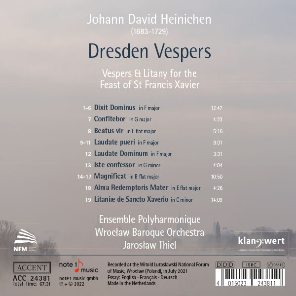 Zum Fest des heiligen Franz Xaver gehörten in Dresden am Vormittag ein feierliches Hochamt und am Nachmittag eine Vesper. Die figuraliter musizierten Texte unterschieden sich nicht von denjenigen zu anderen vergleichbaren Festen. In der Vesper folgten auf die fünf Psalmen des Formulars „De Confessore non Pontifice“ (für einen Bekenner, der nicht Bischof ist) der Hymnus Iste confessor (der in Dresden nur aus drei Strophen bestand), das Magnificat und die marianische Antiphon gemäß der Kirchenjahreszeit – hier das Alma redemptoris mater. Wenn Heinichen in den 1720er Jahren insgesamt 30 Psalmen, acht Magnificat-Vertonungen, ebenfalls acht verschiedene Vesperhymnen sowie fünf marianische Antiphonen komponierte, ermöglichte das für die vorliegende Einspielung die Auswahl aus einem vorhandenem Fundus gemäß den liturgischen Vorgaben. Bei Kompositionen mit datierten Autographen erfolgte für diese Einspielung eine Beschränkung auf die Jahre von 1721 bis 1724, so dass hier die Musik zu einer Vesper vorliegt, die 1724 zum Fest des heiligen Franz Xaver erklungen sein könnte. Umgekehrt konnten die einmal vorhandenen Kompositionen gemäß den liturgischen Vorgaben in einer Art „Baukastensystem“ jederzeit für andere Gelegenheiten wiederverwendet werden. In welchem Umfang die Figuralmusik in der damaligen Dresdner Praxis durch einstimmige Versikel, Lesungen, Antiphonen und Orationen ergänzt wurde, geht aus den erhaltenen Quellen nicht hervor. Angesichts der Zeitvorgabe für die gesamte Vesper und der Länge der zu vertonenden Psalmtexte musste sich der Komponist kurz fassen – mit Ausnahme des Dixit Dominus und des Magnificat, für die etwas mehr Zeit zur Verfügung stand. Heinichen begegnete diesen Anforderungen mit einer konzentrierten Satzweise, die ihm klare und einheitliche musikalische Bilder ermöglichte und nur ausnahmsweise Raum für Subtilitäten der Textausdeutung ließ. Das gilt auch für den Hymnus Iste confessor, der mit seinem stile antico-Satz ohne selbständige Rolle der Instrumente aus dem sonstigen Ablauf herausfällt.
